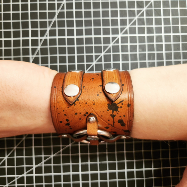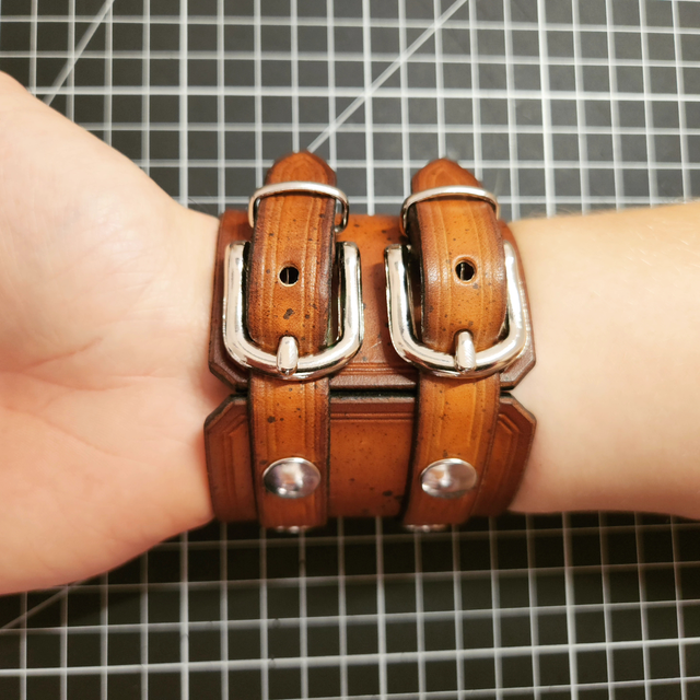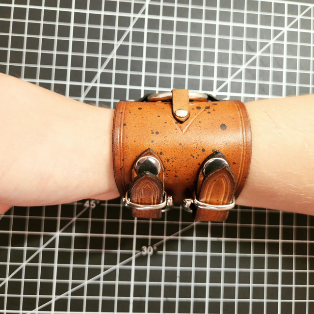 Bracelet en cuir de tannage végétal d'une largeur de 6cm. Épaisseur du corps principal: 3mm. Épaisseur des lanières de fermeture: 2mm